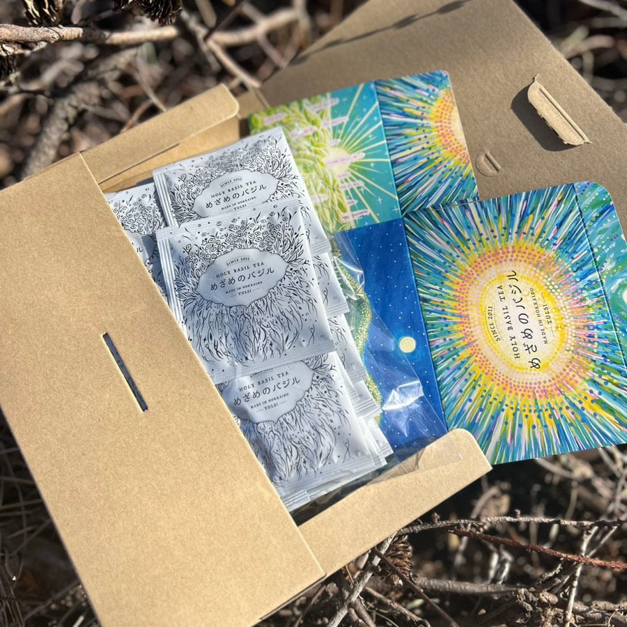 秋にホーリーバジルを株ごと収穫し、陰干しで熟成乾燥させた茶葉と花穂のパウダーを毎日、飲んでほしいからティーパックにしました。そんなティーパック30袋をホーリーバジルの畑を絵にした素敵なボックスに詰め込みました!